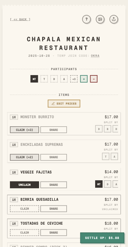 ChatGPT can help reason through a receipt, but a group split needs shared state: people claiming items, shared dishes, payment status, and a host view.